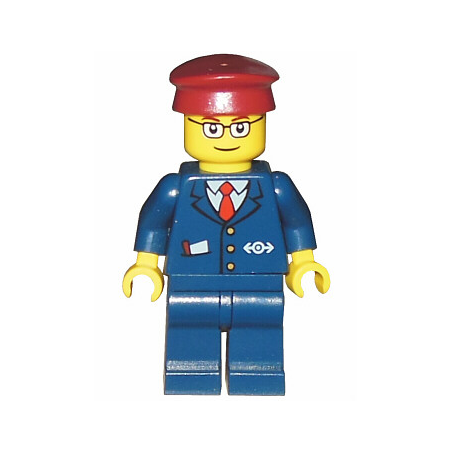 Minifigurine Costume bleu foncé avec logo du train, jambes bleu foncé, chapeau rouge foncé, lunettes rectangulaires - Ingénieur des trains de voyageurs Lego® - trn115