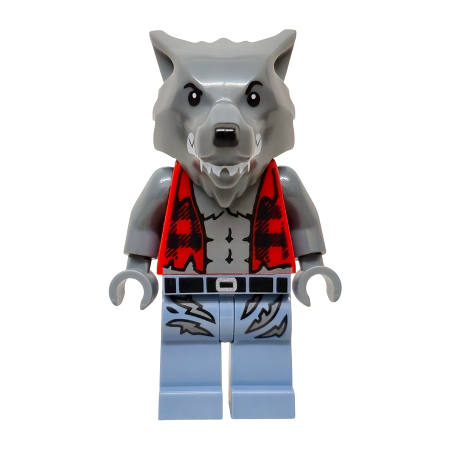 Loup-garou - Chemise de flanelle rouge déchirée, torse nu avec fourrure et muscles, jambes bleu sable avec ceinture et déchirures Lego® - twn527